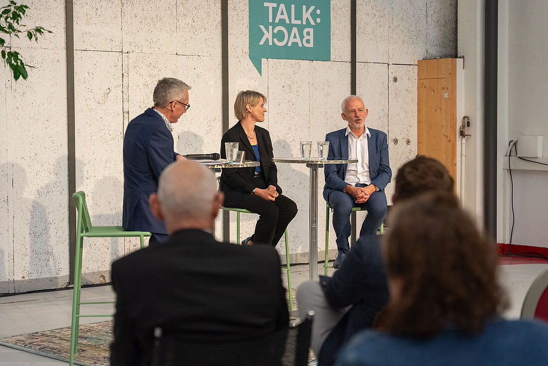 Eine gestapelte Stadt wird es sein, mit 1100 Einwohnerinnen und Einwohnern und rund 3000 Arbeitsplätzen auf rund 34 000 Quadratmetern, mit fast 500 Wohnungen, darunter Tiny Houses, die wirklich «tiny» - winzig - sein werden, 20 Quadratmeter. Aber: Ist Wohnqualität bei so viel Dichte möglich? Dieser Kernfrage stellte sich am Dienstagabend Gabriela Theus in der ersten Folge der Gesprächsreise TALK:back. Theus ist die Geschäftsführerin der Bauherrschaft IMMOFONDS; unter der Moderation von Peter Brandenberger diskutierte sie in der Shedhalle mit Lukas Bühlmann, Stiftungsrat der Stiftung Baukultur Schweiz. Rund 90 Besucherinnen und Besucher wohnten der Diskussion bei oder redeten mit.